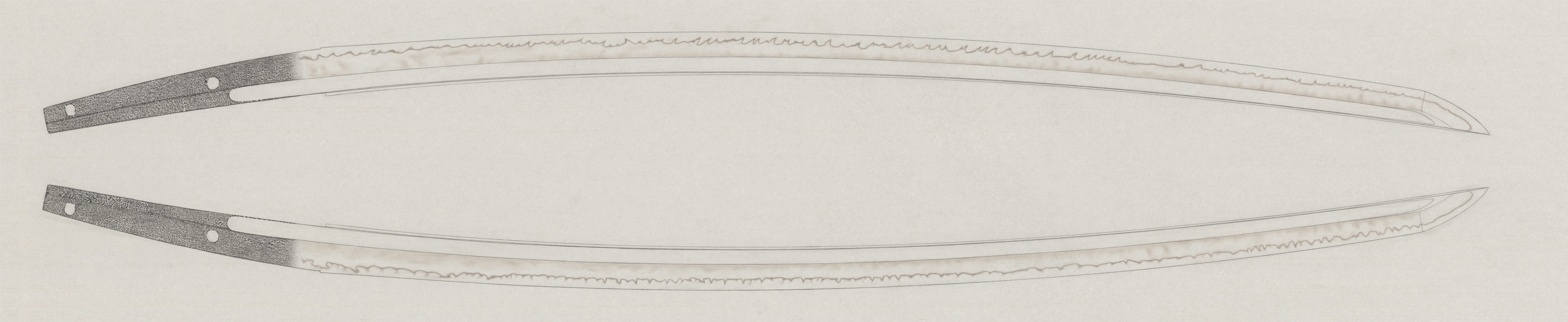 刃文、佩表、全体に潤みごころの小乱れ、金筋入る。佩裏、全体に潤んだ直ぐ刃、一部二重刃がかる。