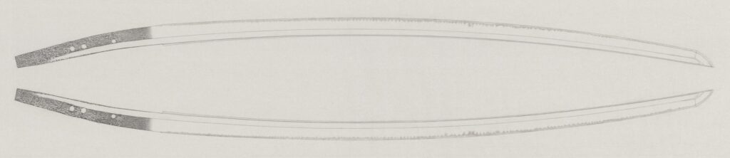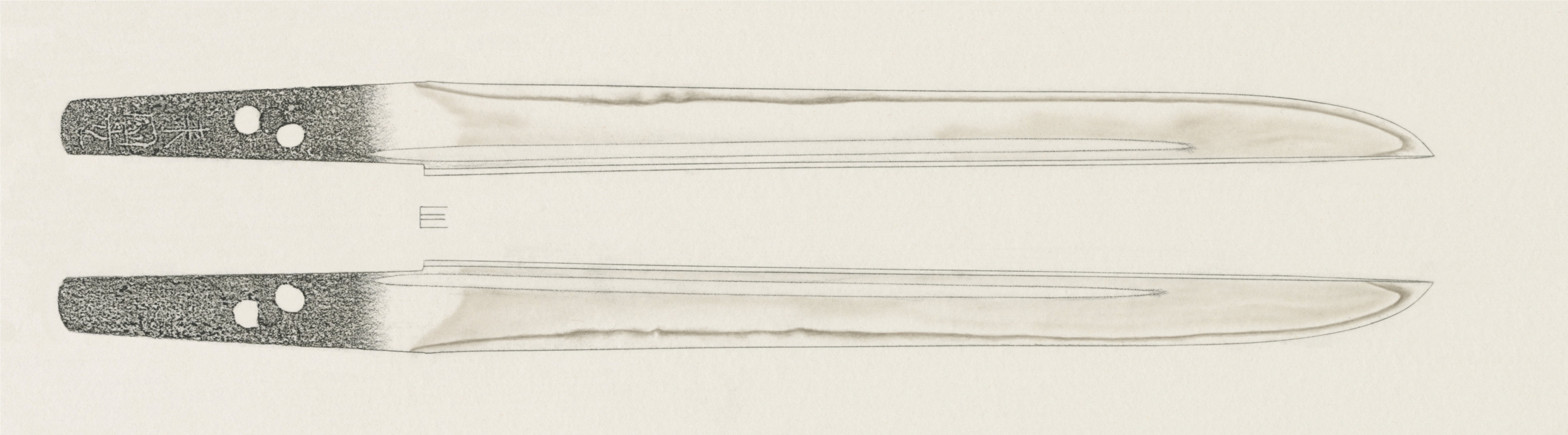 目釘穴2、少し擦り上げと思われ、茎尻に銘。鑢切り。強い舟形、茎尻細って先一文字。棟方、刃方共に肉。