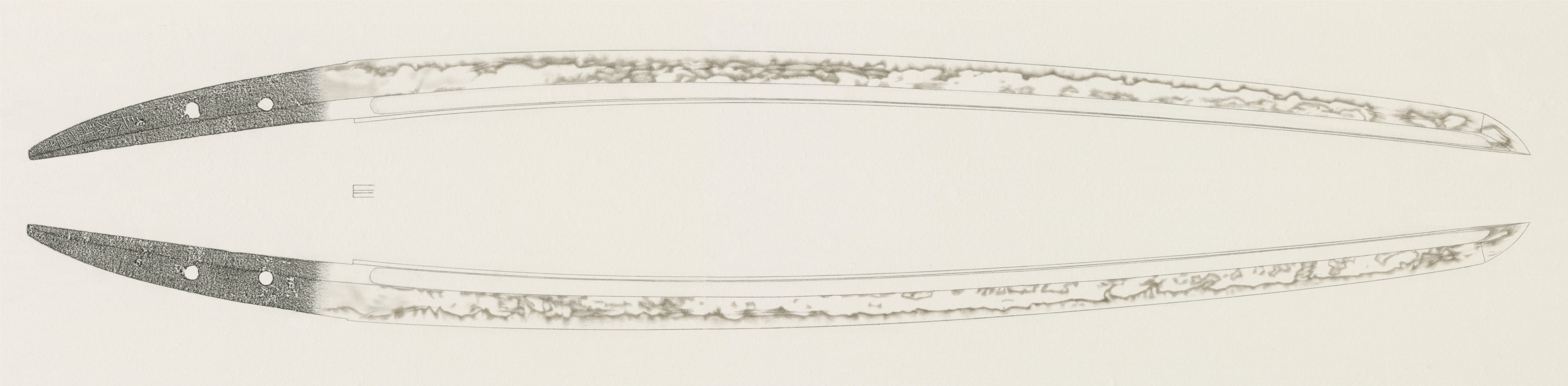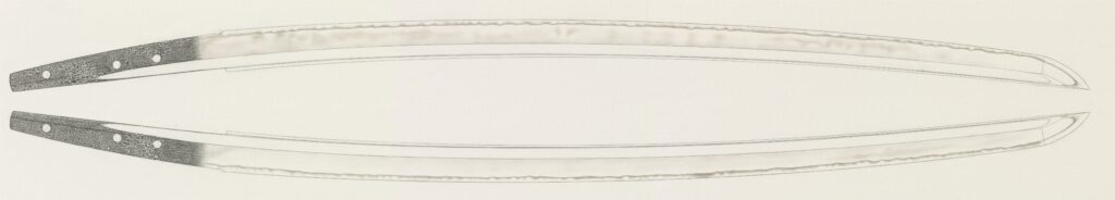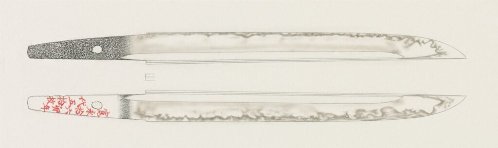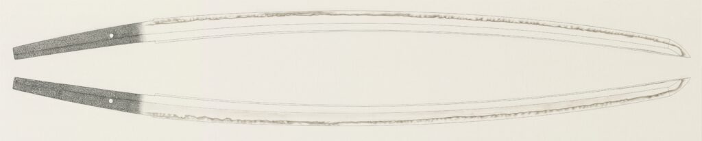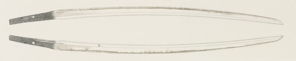 生ぶ茎、目釘穴1、鑢不明。刃方棟方共角。茎尻なだらかに剣形。棟区深い。