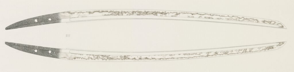 刃文、腰が開く調子の互の目、角張り延びる互の目などを焼き、刃中足よく入り、横手下から焼き高く鎬に達し、全身に飛び焼きかかり皆焼となる。
