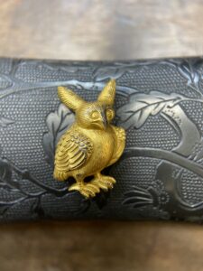また拵の事ですが。小柄は赤銅独楽図です。魚子は手擦れでトロトロに。天正拵は三所などに揃えずバラバラが本来だという話や、やはり古後藤で揃えてこそだとか、図柄で揃えるべき、或いは技法で揃えるべき(例えば小柄笄をうっとりで揃え […]