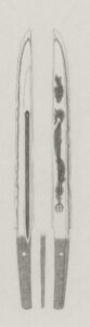 時代は鎌倉末期頃でしょうか、古い大和物の全身はちょっと久々。この時代の大和物の押形採拓は楽しいです。 この刀、両チリの棒樋に添樋がありますがこの場合、刃、添え樋の角2本、鎬筋、棒樋の角2本、棟角、庵と、僅か3cm幅の外形 […]