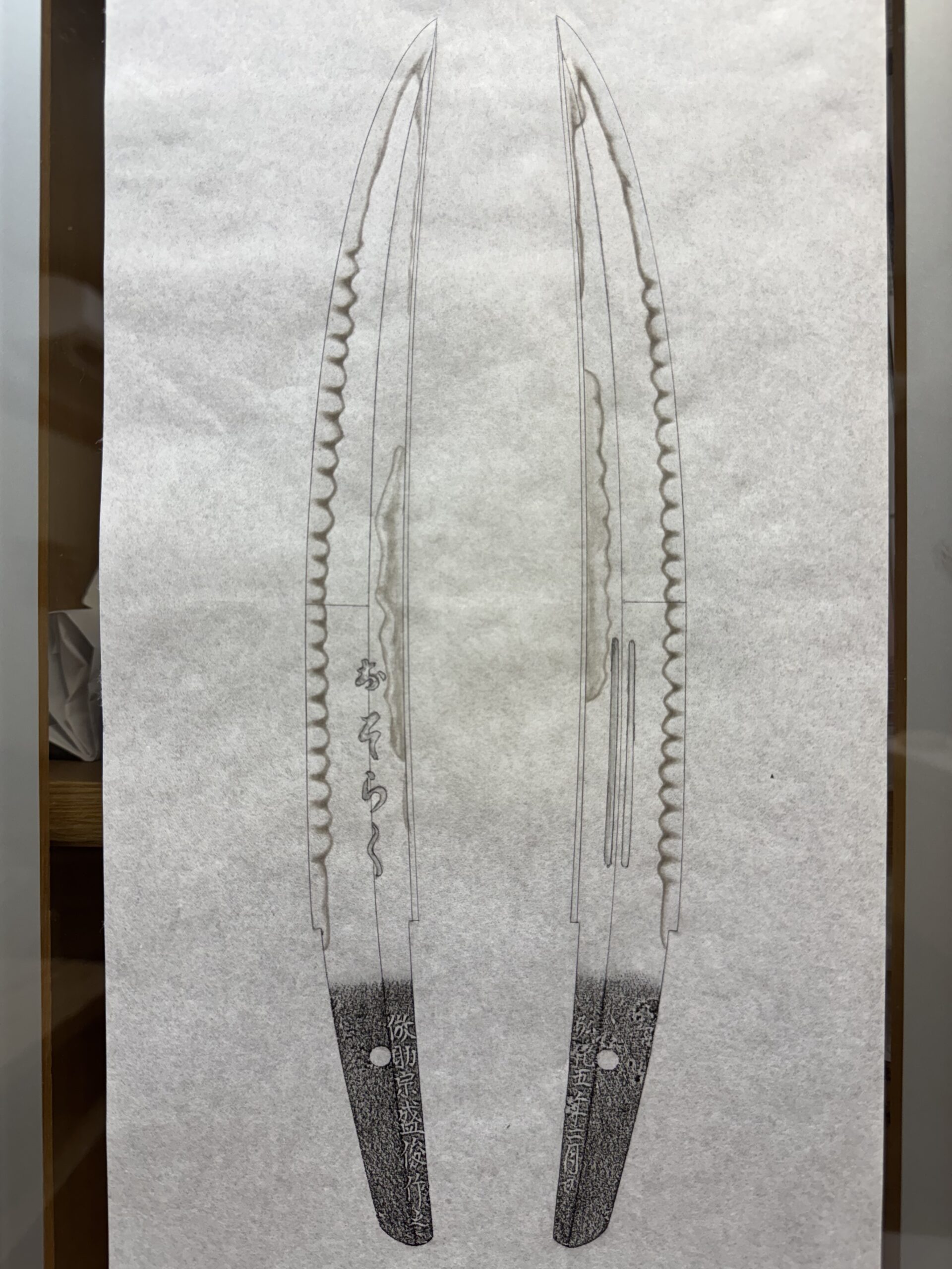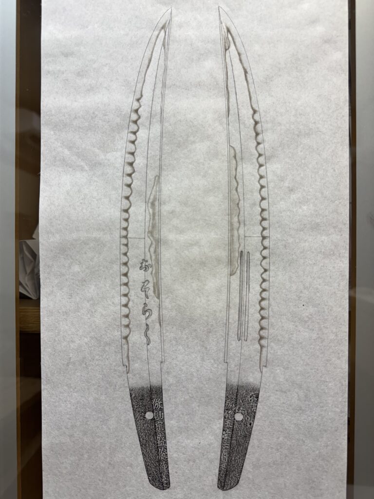 今回全身押形採拓をした盛俊。銘文に「倣助宗盛俊作之」とある通り島田助宗のおそらく造に倣った造り込みで「おそらく」の彫物もあり、刃長もほぼ同じ。ただフクラに鋭さは無く、研ぎ減っていない状態を意識したのかも知れません。