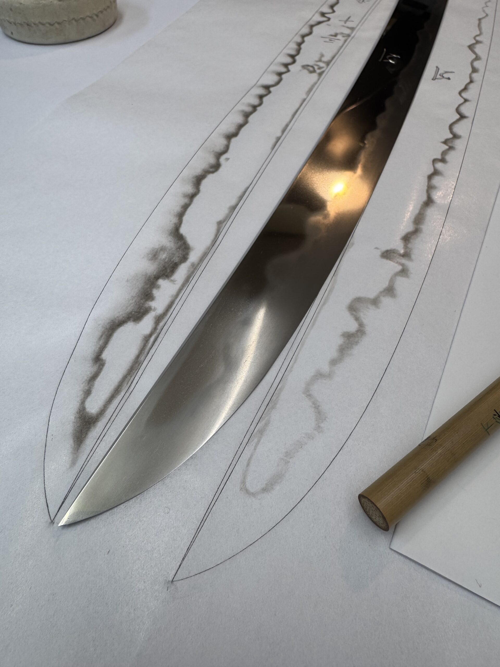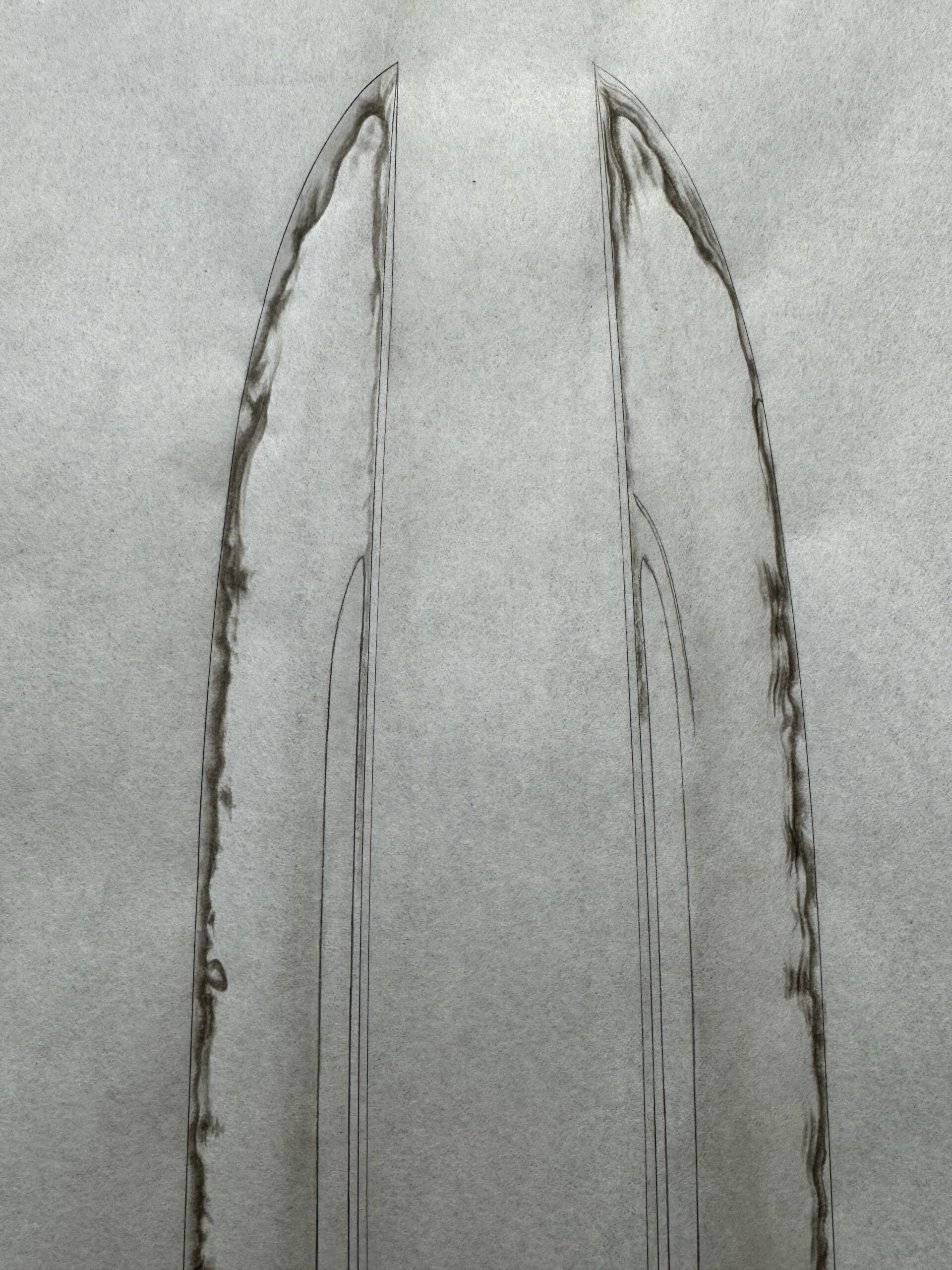 2026年1月11日 / 最終更新日 : 2026年1月11日 j.tamaki ブログ 山城物全身押形 在銘の来を二つ採拓。直刃の方、仮に入札鑑定ならば1札目に新藤五の札が多く入るでしょう。こんな地鉄の来も有るんですねぇ。この地鉄、研ぎが頗る上手い事も要因の一つ。湿潤に抑えつつ小肌を十分引き立たせています。この様な研ぎをするには相当刀が見えていなければ出来ません。やはり研師は刀が見えなければならない。 山城新刀。山城新刀の全身はいつ以来でしょ。。久々と思います。弘幸以来か。