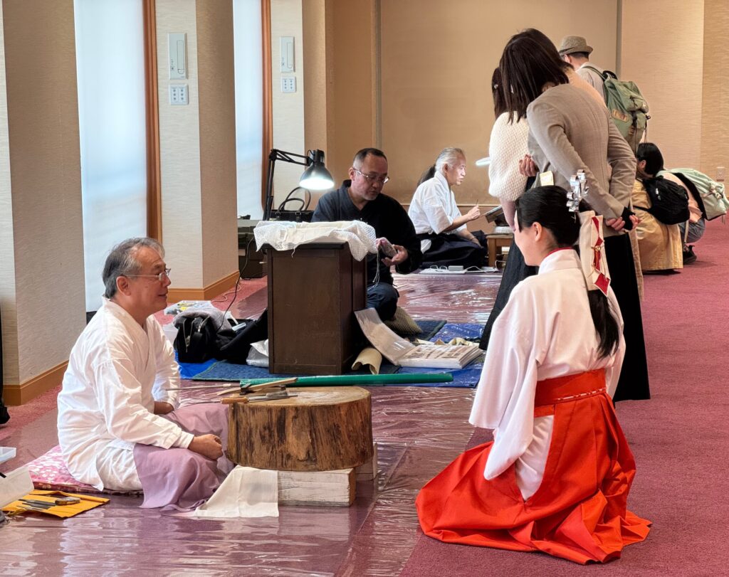 2026年3月31日 / 最終更新日 : 2026年3月31日 j.tamaki ブログ 刀職者実演奉納 北野天満宮様での実演奉納の様子です。手前から、平田実白銀師、遠山和康柄巻師、木下宗風刀身彫刻師。 刀職者実演は、実際の作業を広く皆さまにご覧いただき、日本刀の世界に関心を持ち楽しんでいただくことを目的としています。普段なかなか目にする機会の少ない工程をご覧いただくことで、刀剣への理解が深まれば幸いです。押形については、実際の採拓を一度ご覧いただければその中に要点のすべてが凝縮されています。あとはひたすら練習あるのみ。楽しい趣味になると思います。