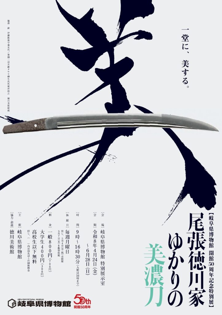 本展は、徳川美術館収蔵刀剣から、これまで公開機会が稀であった美濃・尾張の刀を一挙紹介するものです。戦国期、実用刀として天下人の地元で鍛錬され、用いられた美濃刀は、切れ味のよさや使い勝手が評価される一方、その価値は看過されがちでした。岐阜県博物館開館50周年を機に一堂に会する、これら知られざる美濃刀の優品群は、岐阜の地においてこそ公開の意義があるといえるでしょう。