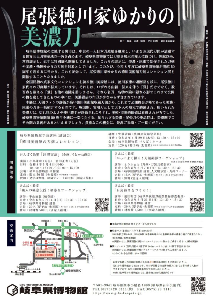 当館の立地する岐阜県関市は、中世の一大日本刀産地を継承し、現在も刀匠が活躍する世界三大刃物産地の一角を占めます。当館では刀剣を展示の柱と位置づけ、昭和51年(1976)の開館以来、常設展示し、近年は特別展等も開催してきました。これらの展示は、美濃・尾張で制作された刀剣や美濃・飛騨ゆかりの刀剣を対象としています。このたび、令和8年度に当館が開館50周年を迎えるに当たり、これを記念して、尾張徳川家ゆかりの徳川美術館刀剣コレクション展を開催いたします。